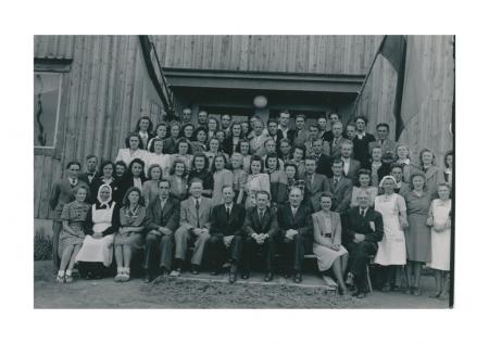 Deltagare vid lägret 13-20 juni 1946. De sittande herrarna i första raden fr.v. magister Bertel Klockars, lärare Ragnar Hertsberg, folkdansledare Rudolf Swahn, förbundssekreterare och lärare Harald Wiik, SÖU:s viceordförande och lektor Alfred Huldén, skådespelare Josef Herler och Anna Maja Holm.