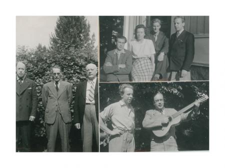 T.v. Mag. J.R. af Hällström, skalden Joel Rundt som höll föredrag på lägret, och värden rektor Joh. Nyqvist. Överst t.h. de fyra gruppledarna för studiegrupperna på lägret vid rektorns trappa: Börje Backholm, Doris Norrgårg, Per Erik Beijar och Magnus Kull. Nere t.h. Breidablicks nyvalada andra lärare socionomen Magnus Kull och rektor Helmer Staffans lägrets sångledare.