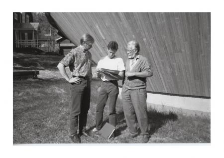 Tre män vid vridläktaren vid Oravais teater