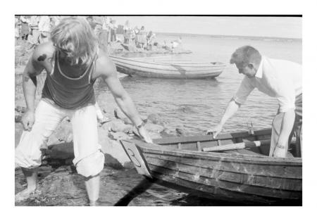 Två män tar i land med en roddbåt