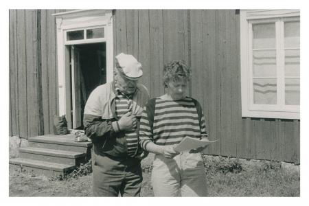 Repetition inför uppförandet av Brudhällornas blod av Hans Fors. Aktörer Sven Staffans och Agneta Bagge gift Agneta Kock
