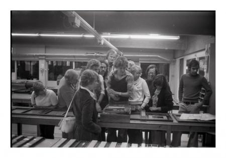 Kursdeltagare i Vörå vid ÖP:s ombrytningsbord under skrivarkurs. Marit Dahlsten, Håkan Westermark, Annika Laxåback, Tom Juslin, Bertel Lindell, Karl-Gustav Olin, Boy Wistbacka, Åsa Laxåback, ledaren Gunnar Packalén, Märtha Versterback och Philip Hällund. Se årsbok 1975