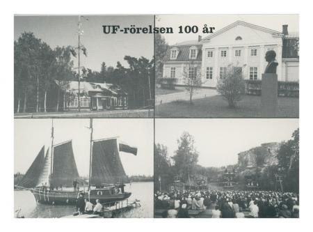 ”En hälsning från den finlands-svenska ungdomsföreningsrörelsens 100 års jubileum i Vasa den 26 mars 1988. BILDERNA: Midsommarstång vid Hammarlands UF:s lokal – Johannes Klockars byst framför Bygdegården i Malax – Galeasen ”Navigator” i ”Åboländskt Sjöslag” vid Västanfjärd - ”Under torparsolen” vid Raseborgs festspel i Västnyland