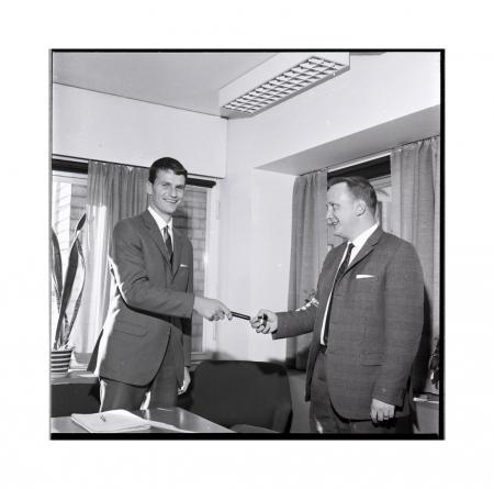 Olav Storgård tar emot ordförandeklubban av bankir Allan Blom. Se årsbok 1968.